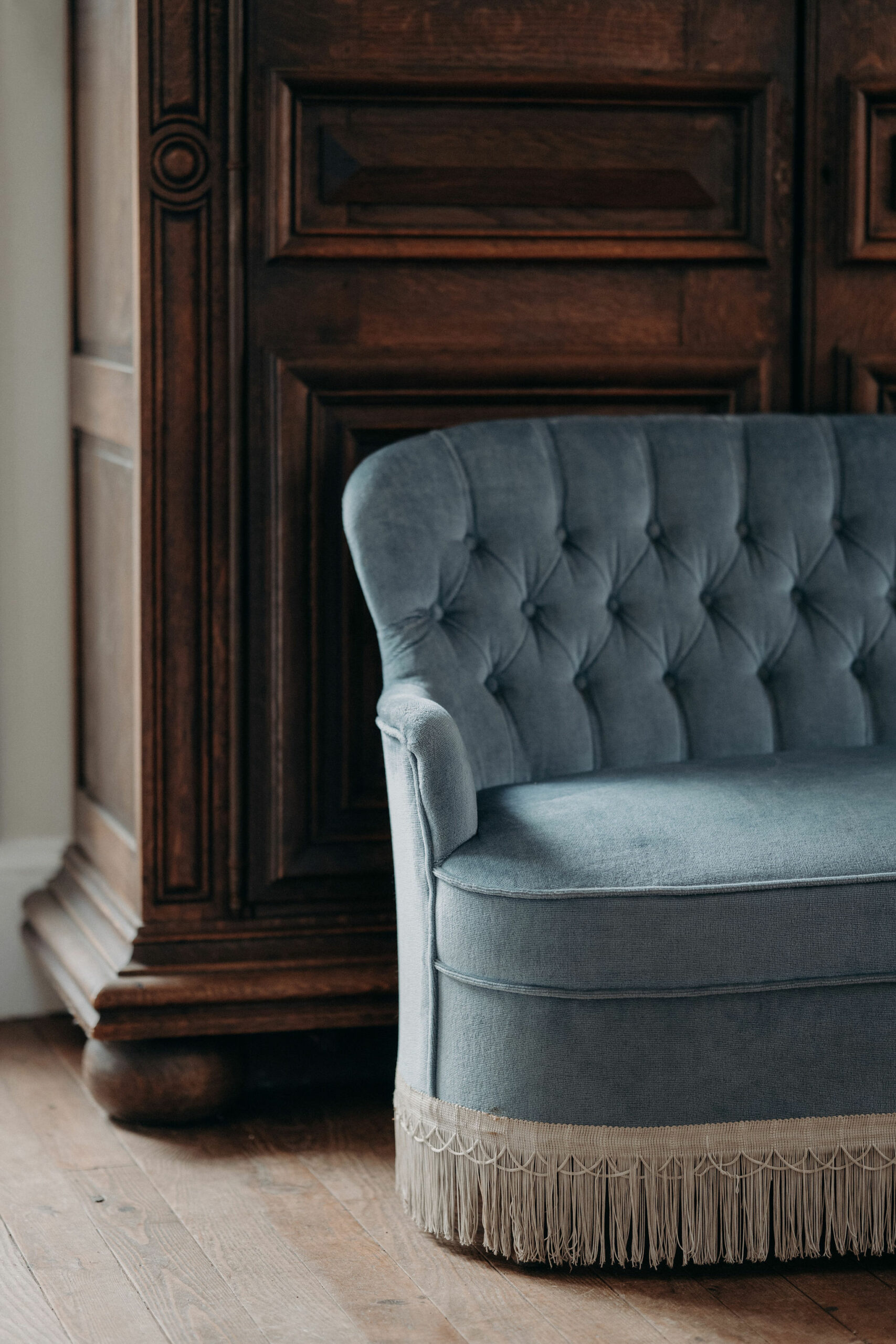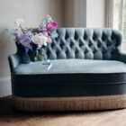 La banquette Ivy allie confort et élégance grâce à son assise type “crapaud” et son revêtement bleu profond.