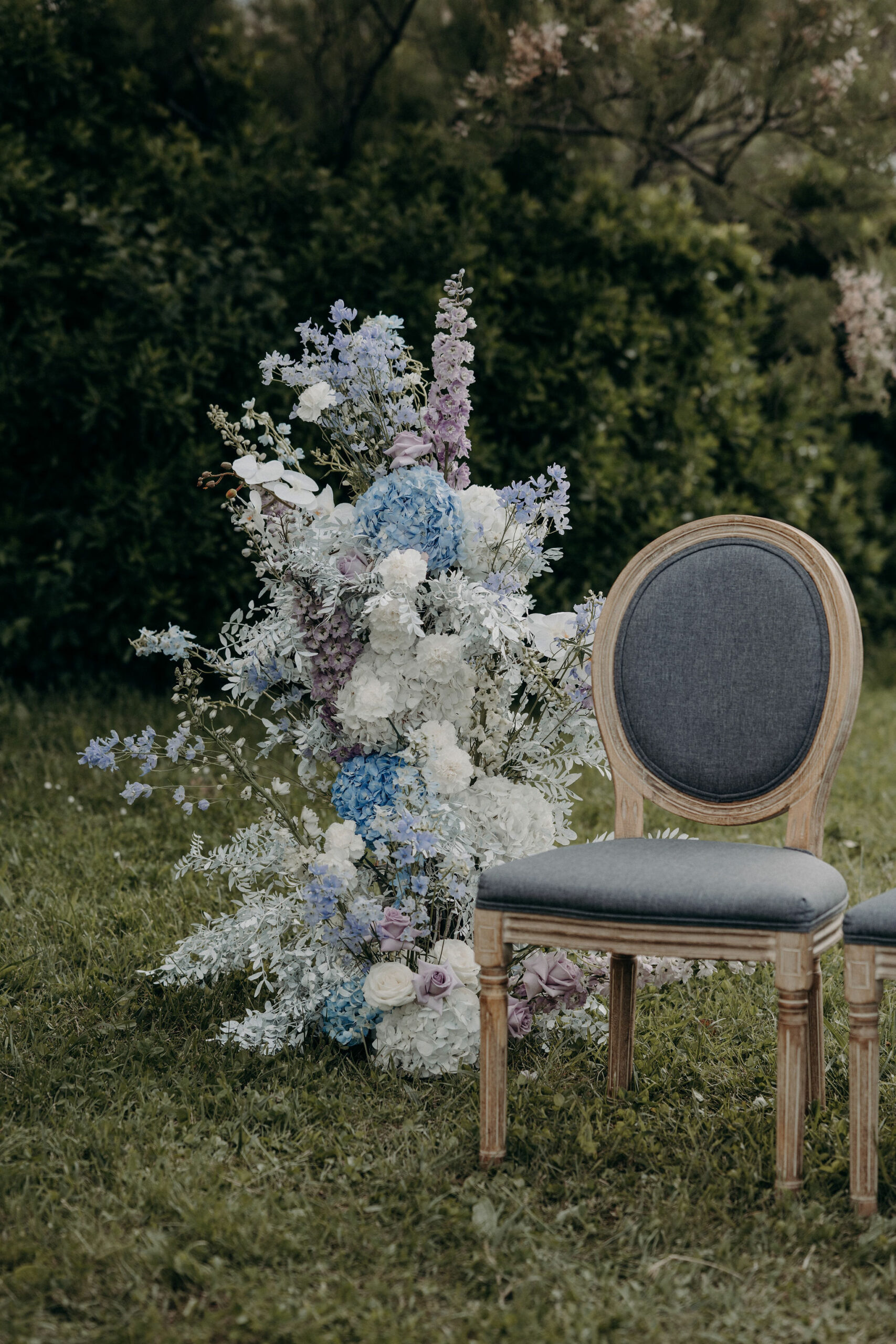 Avec leur assise et dossier rembourrés en tissu gris bleu, elles apportent une touche raffinée et intemporelle à vos cérémonies ou coins photos.